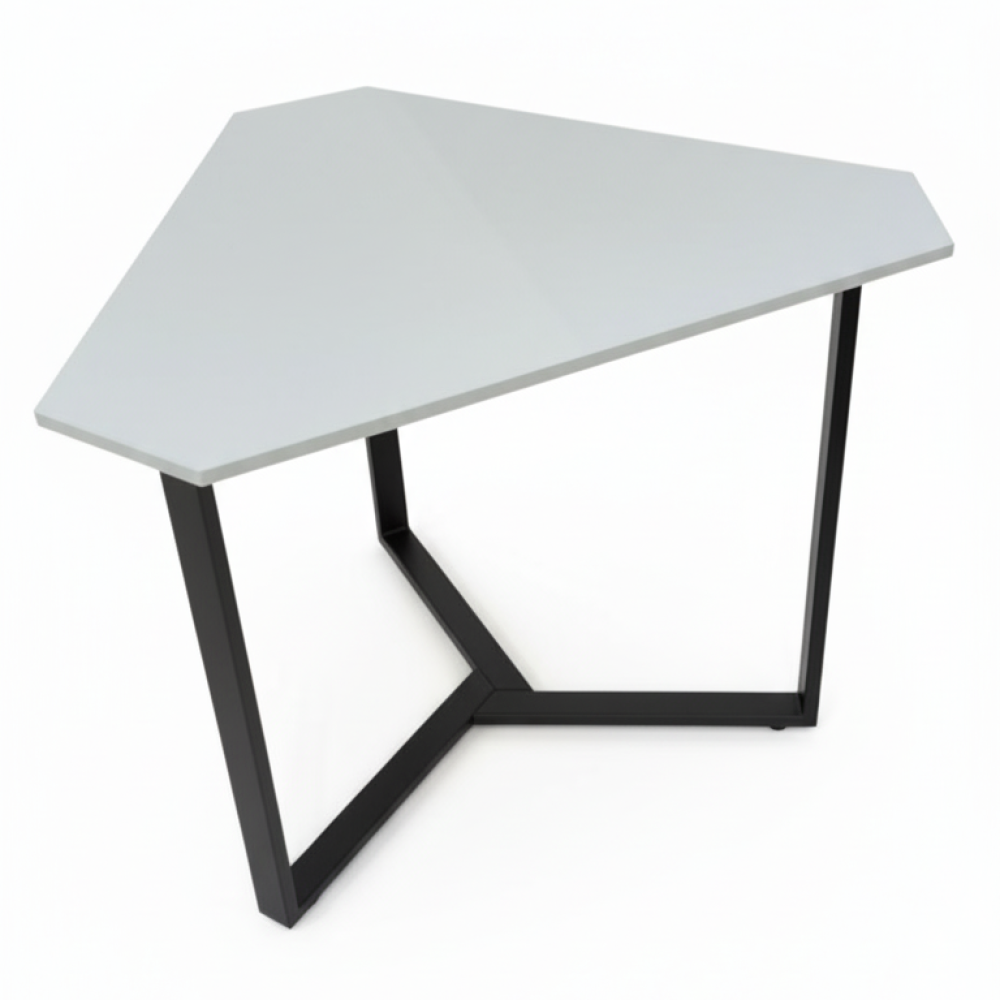 The metal frame of the table has a functional geometric shape that fits under the corner tabletop.