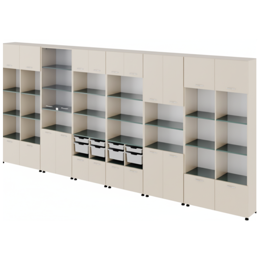 The Standard wall unit is a classic solution for furnishing a physics classroom. It combines closed cabinets for safe storage of instruments and materials with open shelves for books, visual aids, and everyday teaching resources. With its neutral design and durable build, the unit meets school furniture standards and helps maintain an organized learning environment.