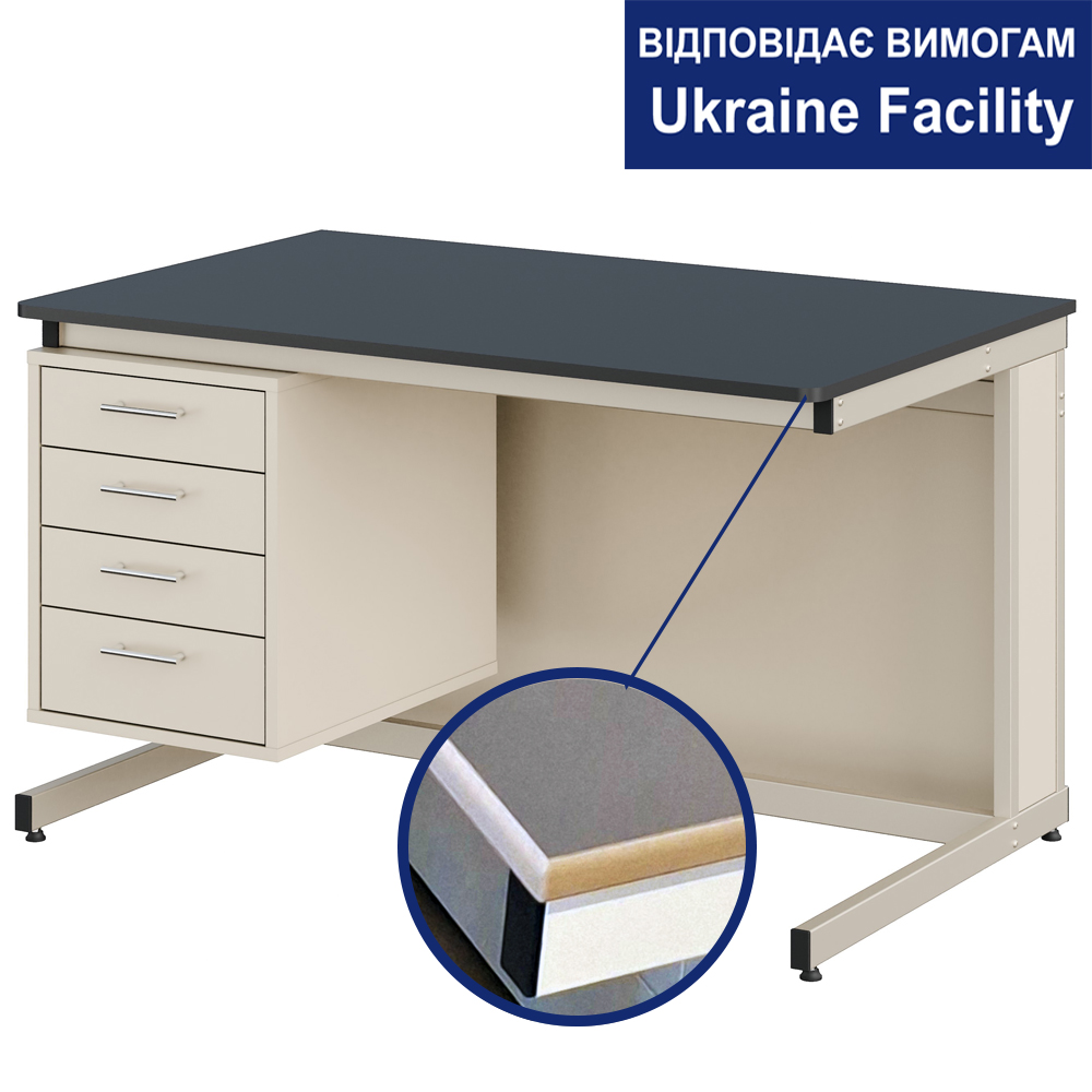 Стільниця виготовлена з МДФ товщиною 16 мм, вкрита HPL-пластиком; радіус заокруглення торців 8 мм, торці зашліфовані та вкриті прозорим лаком на водній основі, труба прямокутного перетину 50х25 мм, листовий метал 1 мм, ніжки на регульованих опорах. 4 шухляди. Орієнтовна вага 65 кг. *можлива опція: кріплення до підлоги. |